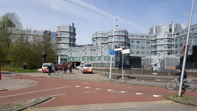 Ambulances en een traumahelikopter kwamen ter plaatse. Er is geen rookontwikkeling te zien. Wel is er veel politie inzet te zien. De marechaussee heeft de toegang tot het gebouw afgesloten en ook de doorgang voor fietsers en voetgangers is afgesloten.