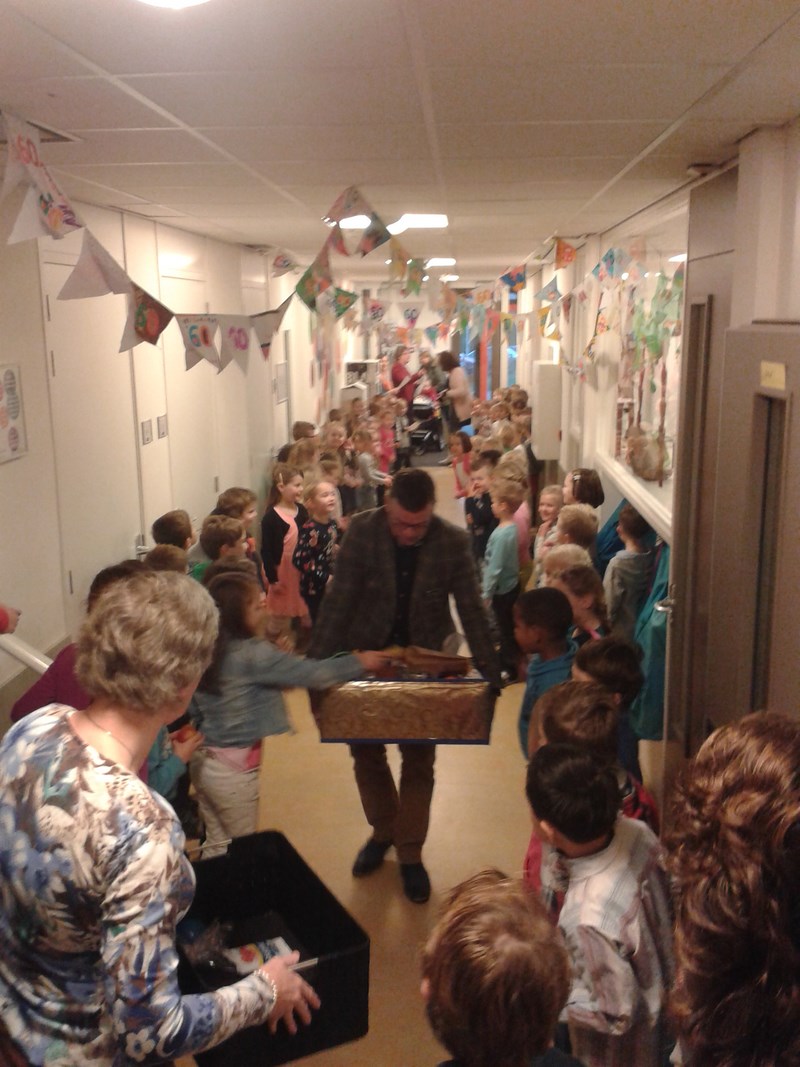Op woensdag 7 januari werd meester Jaap 60 jaar. Dat lieten de kinderen van de Koningin Wilhelminaschool in Driemanspolder niet ongemerkt voorbij gaan. De gang en aula waren versierd met zelfgemaakte slingers en van ieder kind kreeg de meester een gezond cadeau terwijl hij werd toegezongen in de gang en aula. Meester Jaap bracht voor de kinderen een broodje knakworst en een mandarijn mee!