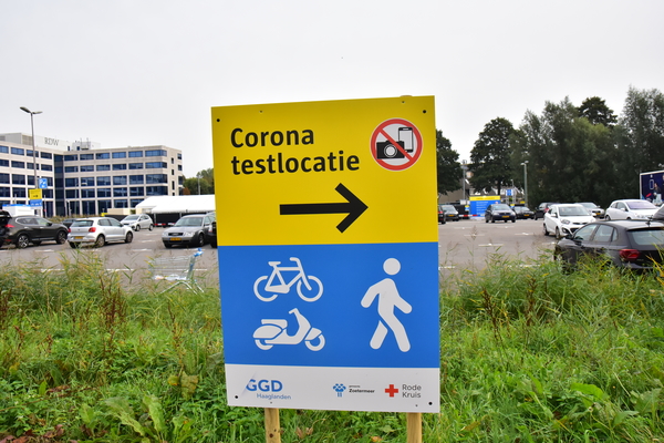De Coronateststraat op het parkeerterrein aan de Denemarkenlaan is gesloten vanwege de harde storm. Een informatiebord bij de testlocatie is omgewaaid. De teststraat vangt veel wind vanwege het onbeschutte parkeerterrein.