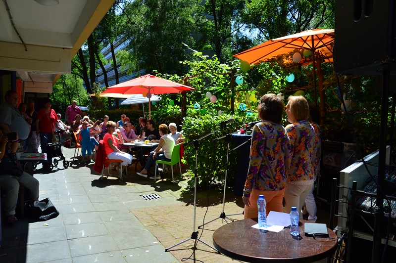 Zaterdag 27 juni ontmoetten alle buurtbewoners en de bewoners van Middin elkaar in de tuin en de ontmoetingsruimte van Middin. Iedereen smulde van lekkere hapjes en taartjes en kon meedoen aan de activiteiten: springkussen, schminken, diverse oudhollandse spelletjes voor de kinderen en voor de volwassenen was er een live optreden van het vocal groep Encore.