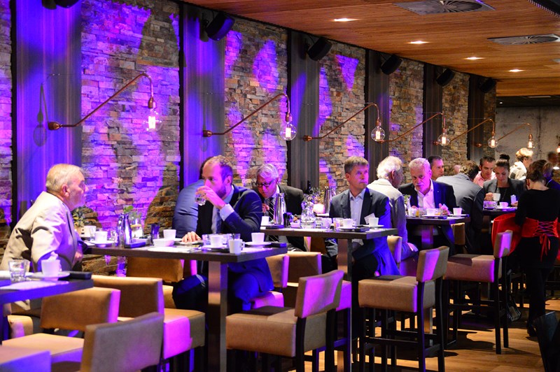 Gastspreker Luc Aben, Hoofdeconoom van Van Lanschot, stapte de arena in, te midden van de ondernemers om als Belg te vertellen dat rood het nieuwe oranje gaat worden, dat wij Nederlanders dadelijk Belgische worstjes en bier in huis gaan halen om de rode duivels aan te gaan moedigen op het EK voetbal. Zo wist hij de aandacht te krijgen en meteen de stap te maken naar zijn macro economische visie. "Nederland zit economisch in de lift, maar pas op voor teveel positiviteit, want dit is in vergelijking met de gemiddelde economische ontwikkelingen van Europa en daar zitten dus ook landen als Griekenland, Spanje en Ierland bij," vertelde hij. Met wat extra minuten spreektijd 'gestolen' te hebben, kreeg Luc Aben een enorm applaus van de aanwezigen die zijn voordracht enorm waardeerden.