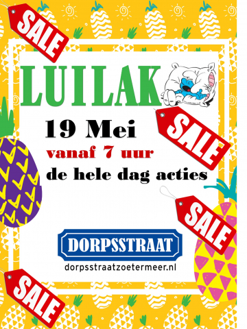 De Dorpsstraat viert zaterdag Luilak: vroege vogels krijgen extra korting, die kan oplopen tot wel 40%. Je moet dan wel om 7 uur 's ochtends al in de winkel staan. Maar ook aan de echte luilakken die het niet lukt om vroeg op te staan is gedacht, na 10 uur sluiten zich andere winkels aan met nog meer aanbiedingen.