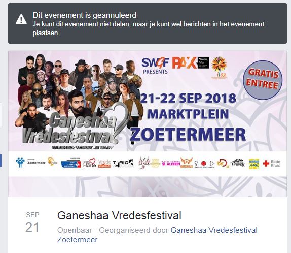 Het Ganesha Vredesfestival dat dit weekend op en rond de Markt zou plaats vinden is geannuleerd. De organisatie zag zich door het uitblijven van de benodigde vergunning gedwongen om het hele festival af te blazen.