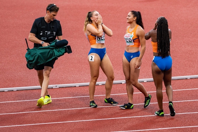 Twee zussen in de 4 x 100 meter estafette finale voor vrouwen op het EK Atletiek in München. Voor Naomi (27) en Zoë (20) Sedney uit Zoetermeer kwam deze week in München een droom uit. Beide zussen liepen op het EK in hetzelfde estafetteteam.