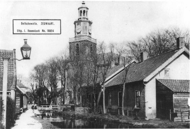 Foto 2 De Oude Kerk met het water van de Delftsewallenwetering. Rechts de huizen Delftsewallen nr. 1 t/m nr. 9.De lantaarn links verlichtte later de ingang van de gasfabriek die hier gestaan heeft van 1907 tot 1917.: Stadsarchief Gemeente Zoetermeer, fotograaf: J. Heemskerk
