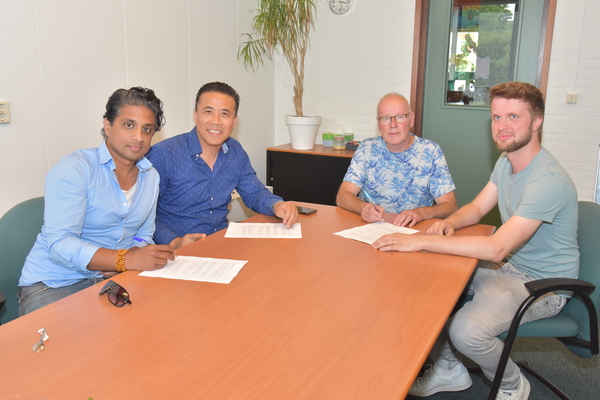 Op de foto rechts: Rakesh, Hashem, Gerard en Jochem tijdens de ondertekening.
